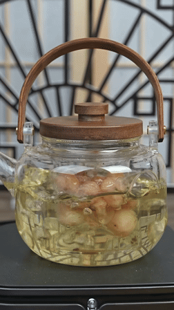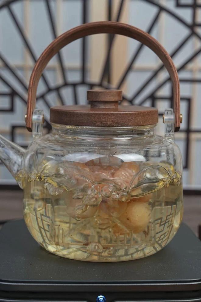 5、热水冲泡后,果肉会逐渐吸水膨胀,5-10 分钟就能泡开,汤色呈清澈的淡黄色,无浑浊杂质,凑近能闻到浓郁的桂圆清香